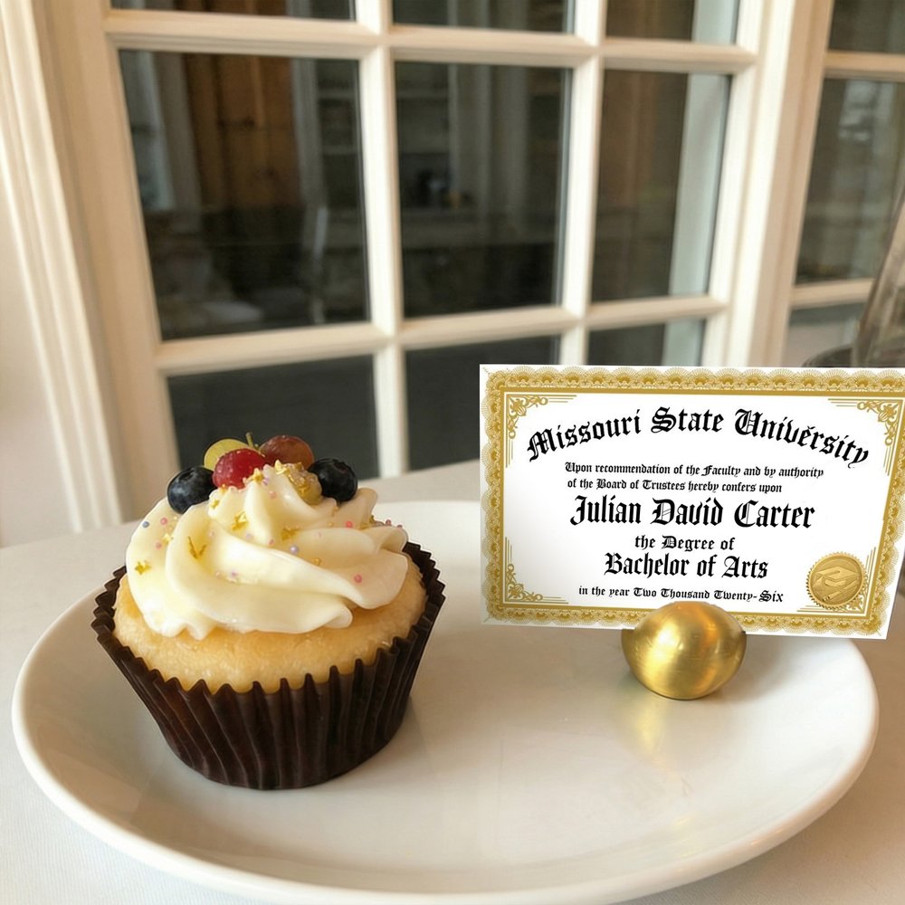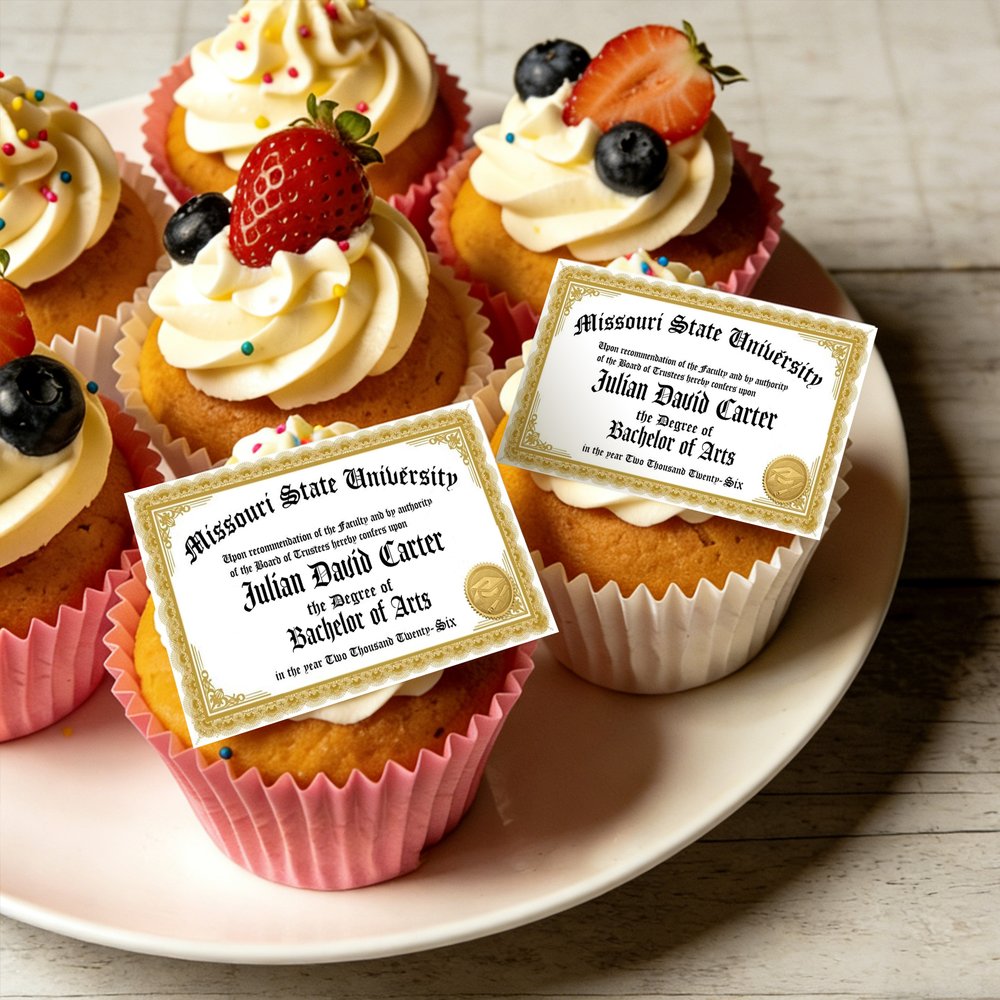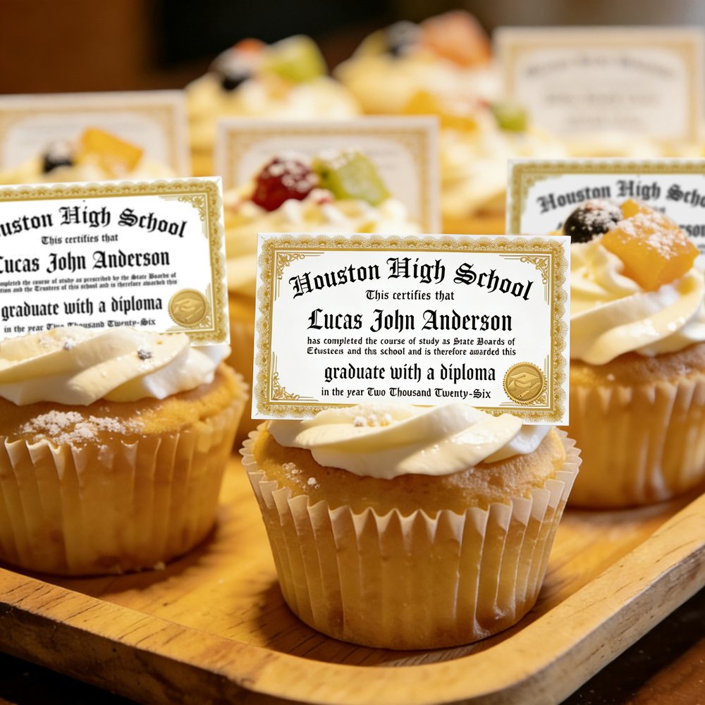 This Custom Graduation Diploma Cupcake Topper Set features a vintage-inspired diploma design, complete with elegant script font, ornate borders, and a gold seal. The topper can be personalized with the graduateās name, school name, and degree āmaking every cupcake a tiny, celebratory tribute to their hard-earned achievement.