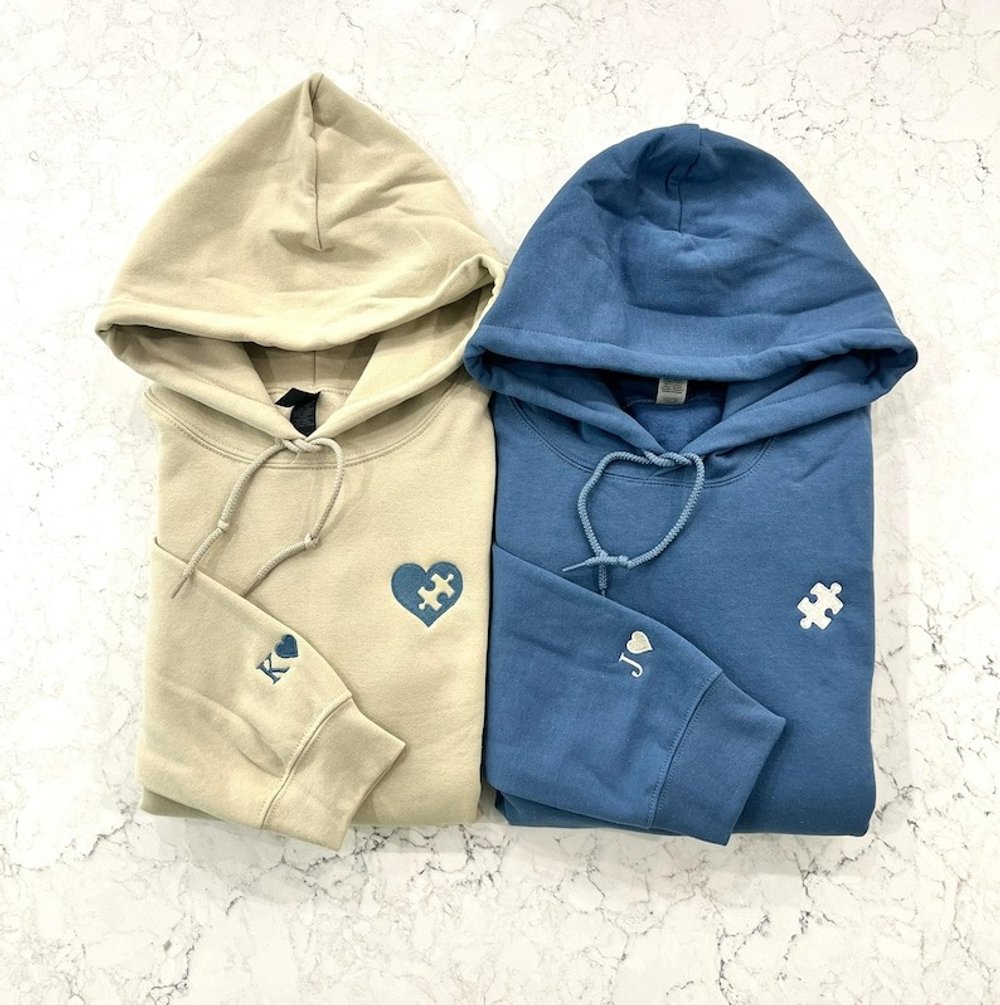 Heart & Puzzle Embroidered Front: A soft, textured emblem of love and connection Custom Initials on Sleeve: Personalized just for you or your loved one Premium Material: High-quality cotton/polyester blend – warm, durable, and preshrunk for lasting comfort Cozy Features: Double-lined hood, pouch pocket, and stretchy ribbed cuffs for all-day ease