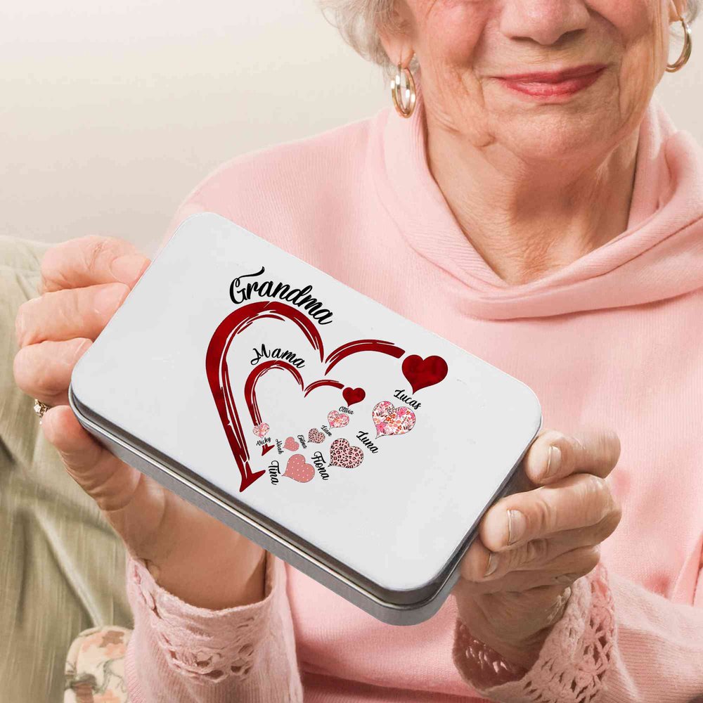 The sewing tools set box cover is printed with a single or double layer of hearts and can be customized with the names of family members or children. The tools feature an elegant Victorian-style embossed texture. The overall design combines vintage aesthetics with a sense of exclusivity, serving as both a toolbox and a delicate decorative piece.